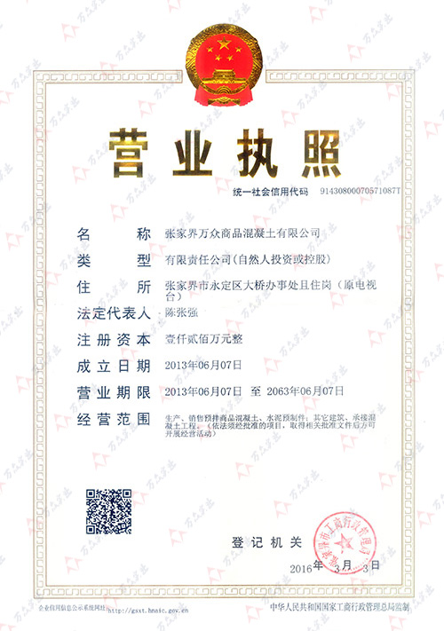 張家界萬(wàn)眾商品混凝土有限公司營(yíng)業(yè)執(zhí)照
